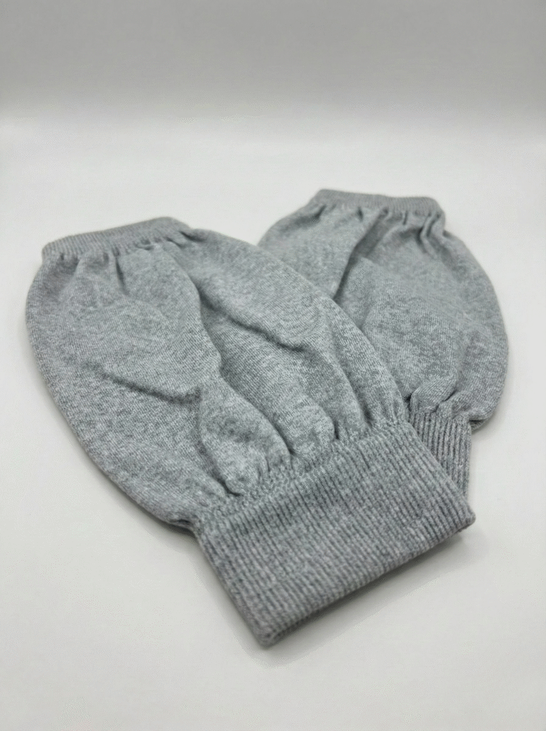 採用高彈性針織羅紋組織(Knitted Rib Structure),具備優異的延伸回覆率。因此本產品除標準手臂防護外,亦可適用於小腿與腳踝部位(長度 23cm 規格)。以此填補無塵褲管與無塵鞋之間的防護間隙,並透過貼合的包覆力防止微粒外洩,確保全套無塵服裝系統的完整性。